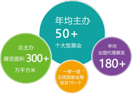 ????中機國際每年境內外主承辦 50 余場展會,展會面積超 300 萬平方米,辦展數量和面積在《中國境內組展機構 50 強》排行榜中名列前茅 ;每年組織出國代理展 180 個 ;連續 8 年在中國貿促會發布的《中國展覽經濟發展報告》排名中組展項目數量位列全國第一,是中國最大的海外組展機構之一 ;擁有全球的渠道和網絡,出展足跡遍 布 100 多個國家、300 多個城市,累積 3100 多次國際展覽經驗。